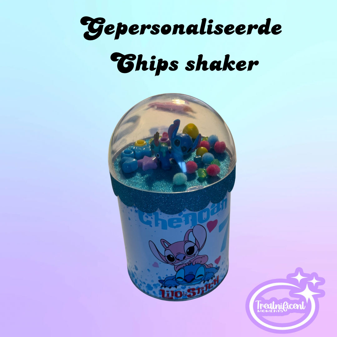 Wil je jouw gepersonaliseerde chips blikje extra opvallend en feestelijk maken? Kies dan voor onze Shaker-optie! Hierbij plaatsen we bovenop het blikje een halve bol gevuld met kraaltjes en bolletjes.