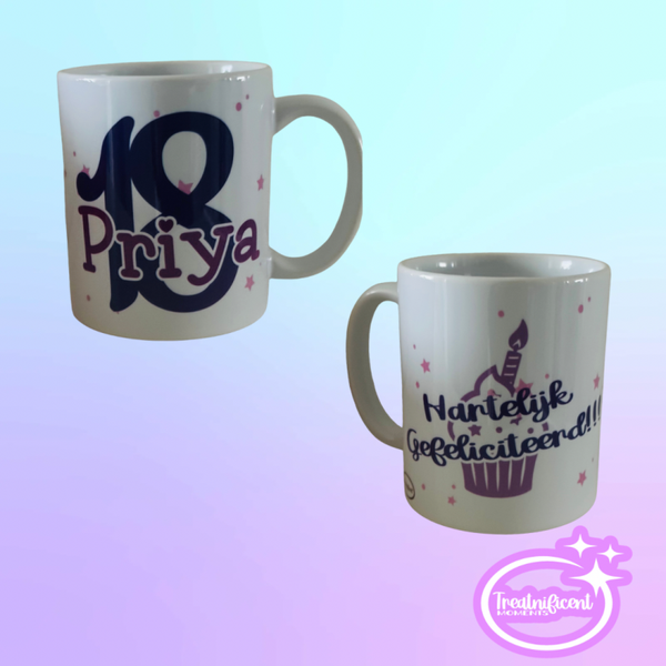 Vermeld in de opmerkingen welke naam of tekst je op de mok wilt laten drukken.
